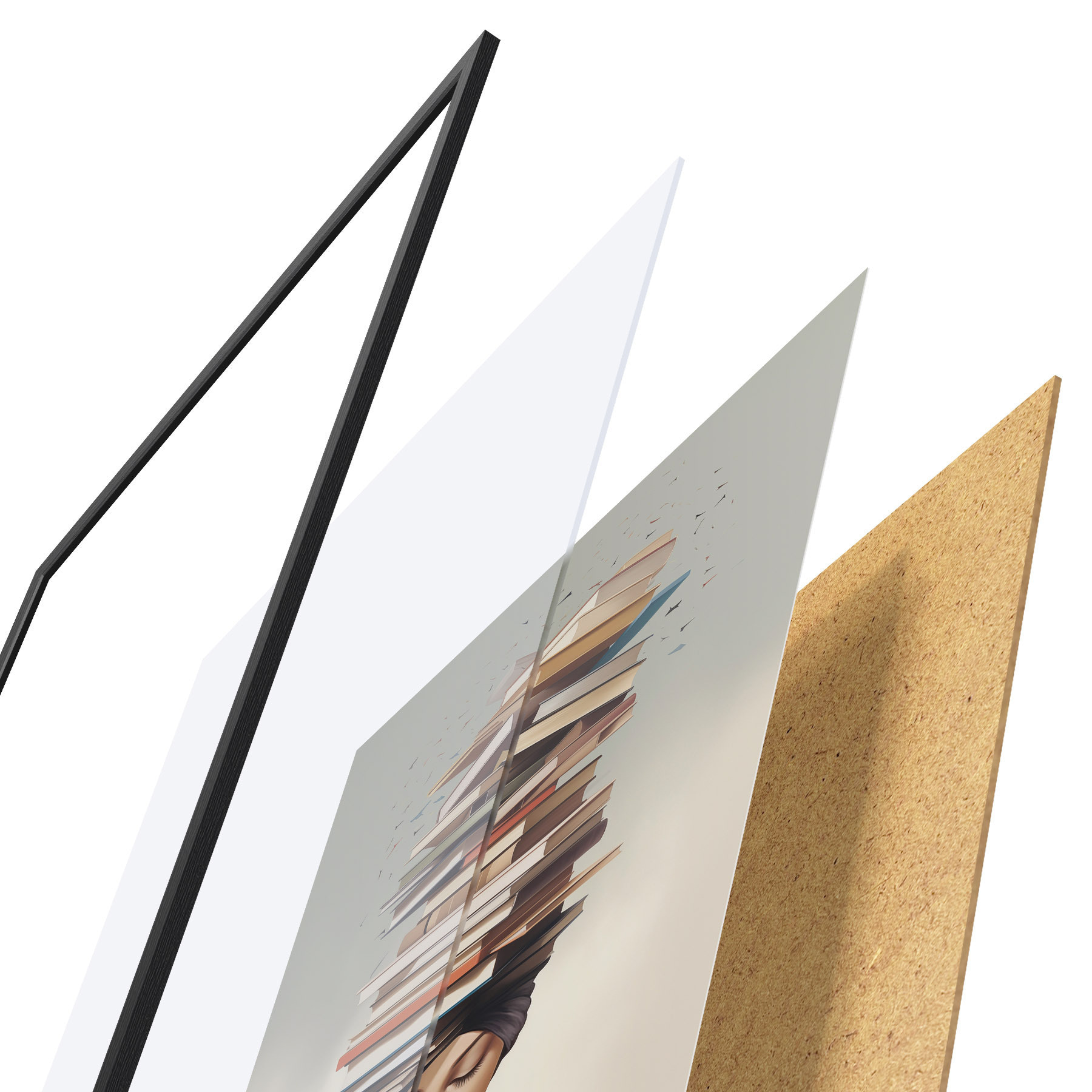 De poster bestaat uit een frame, plexiglas, geprinte afbeelding en spaanplaat achterkant. De poster kan meteen aan de muur worden gehangen dankzij de bevestigingen op de achterkant.