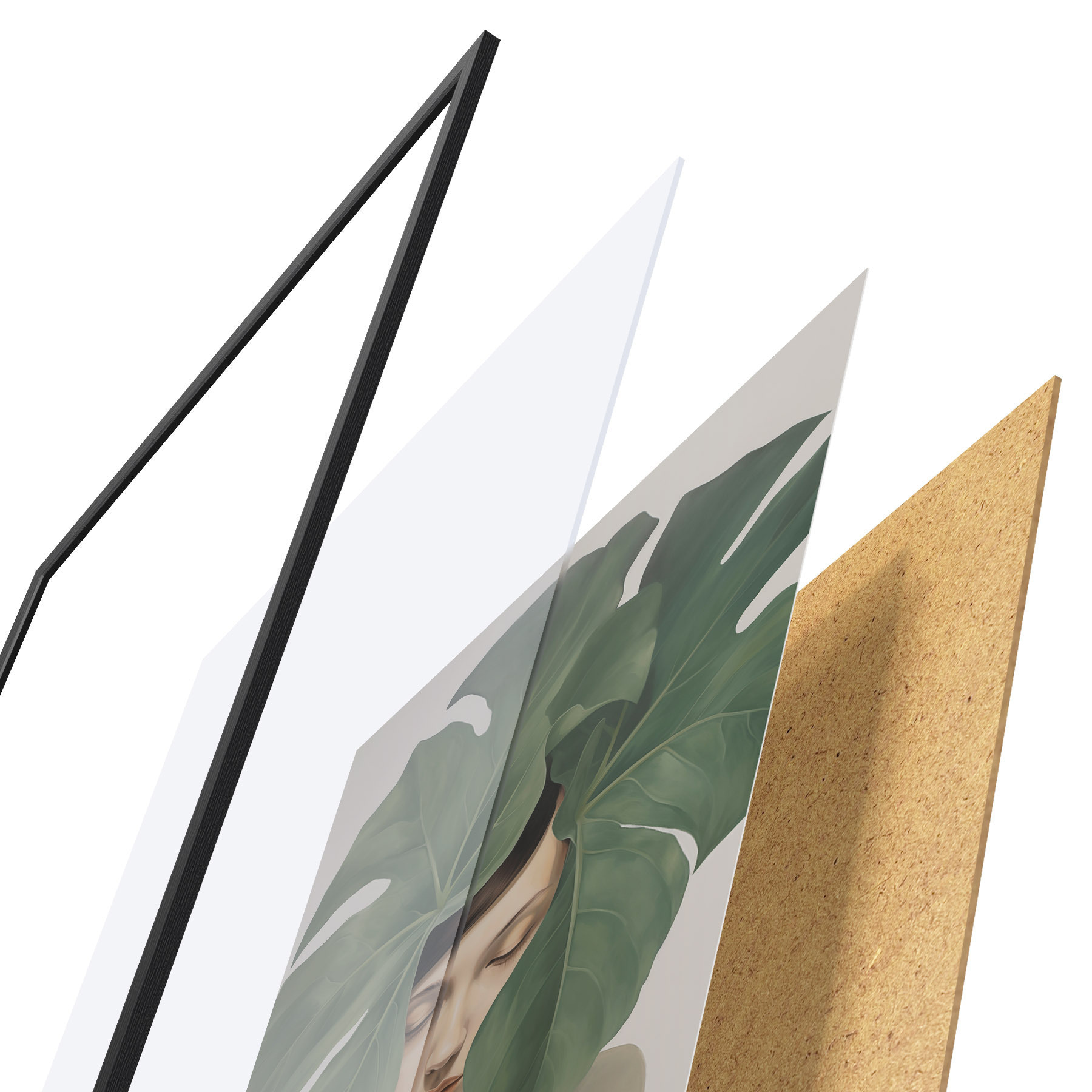 De poster bestaat uit een frame, plexiglas, geprinte afbeelding en spaanplaat achterkant. De poster kan meteen aan de muur worden gehangen dankzij de bevestigingen op de achterkant.