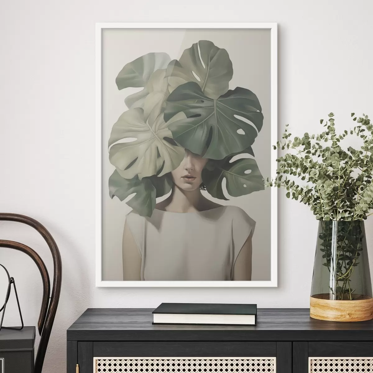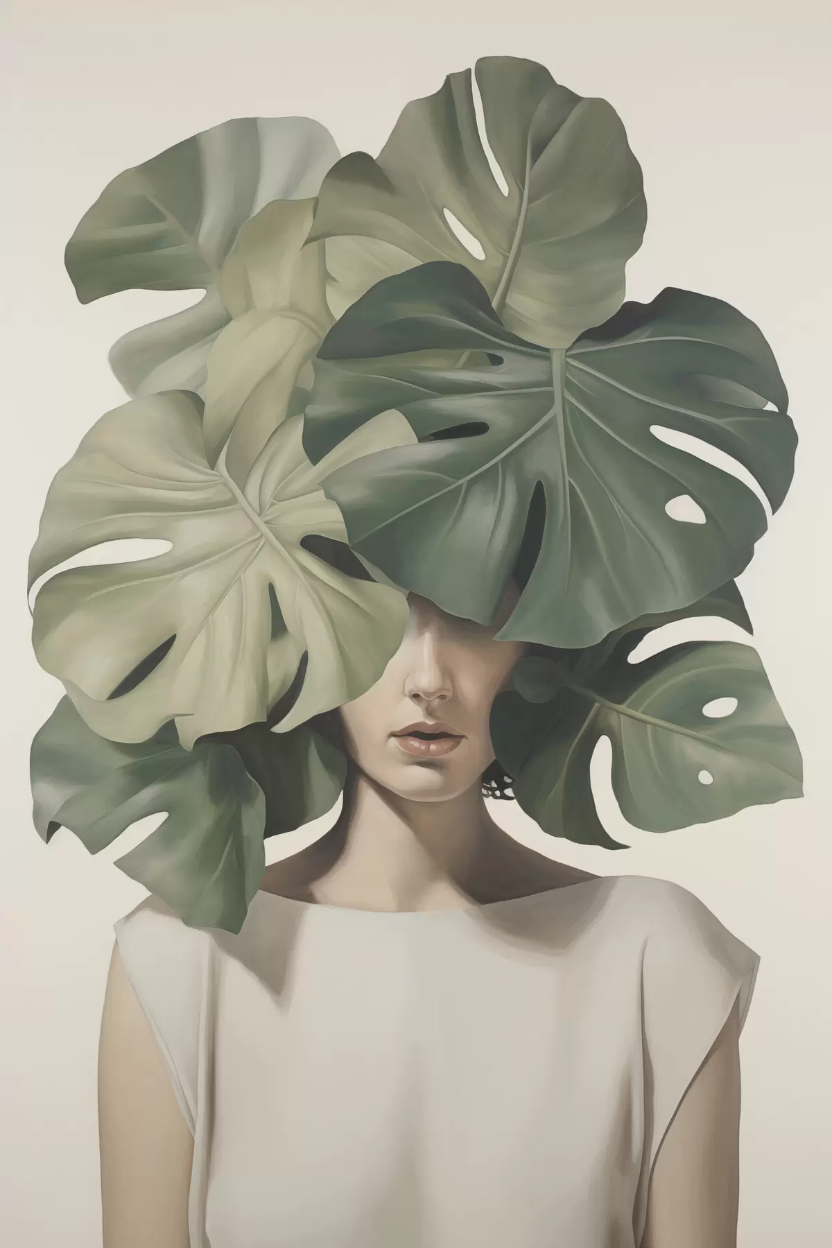 Poster Abstract portret van een meisje met monstera-bladeren N° f47336