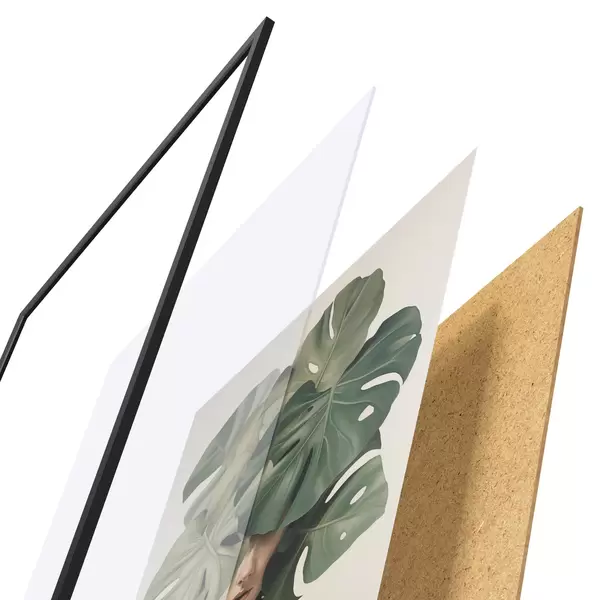 De poster bestaat uit een frame, plexiglas, geprinte afbeelding en spaanplaat achterkant. De poster kan meteen aan de muur worden gehangen dankzij de bevestigingen op de achterkant.
