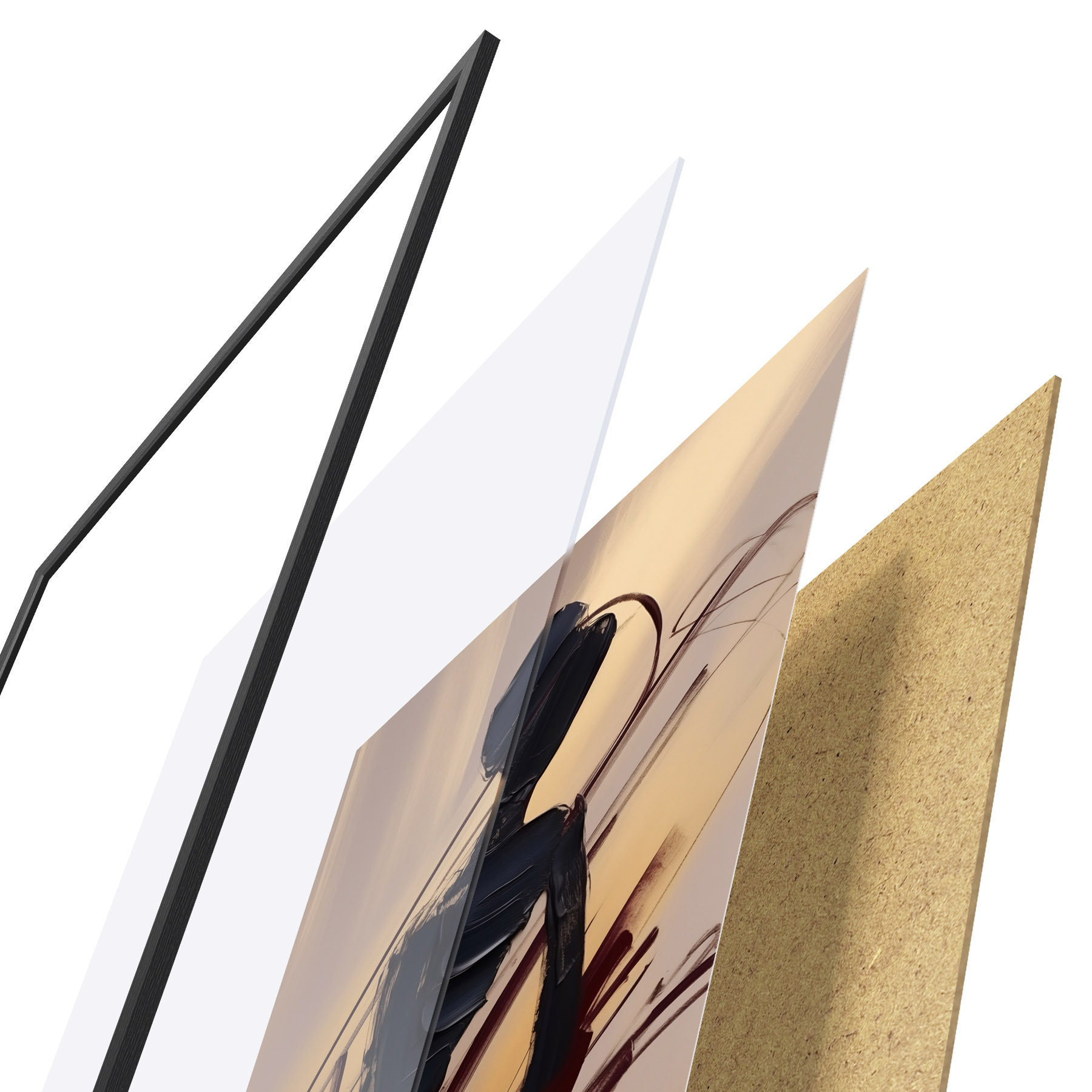 De poster bestaat uit een frame, plexiglas, geprinte afbeelding en spaanplaat achterkant. De poster kan meteen aan de muur worden gehangen dankzij de bevestigingen op de achterkant.
