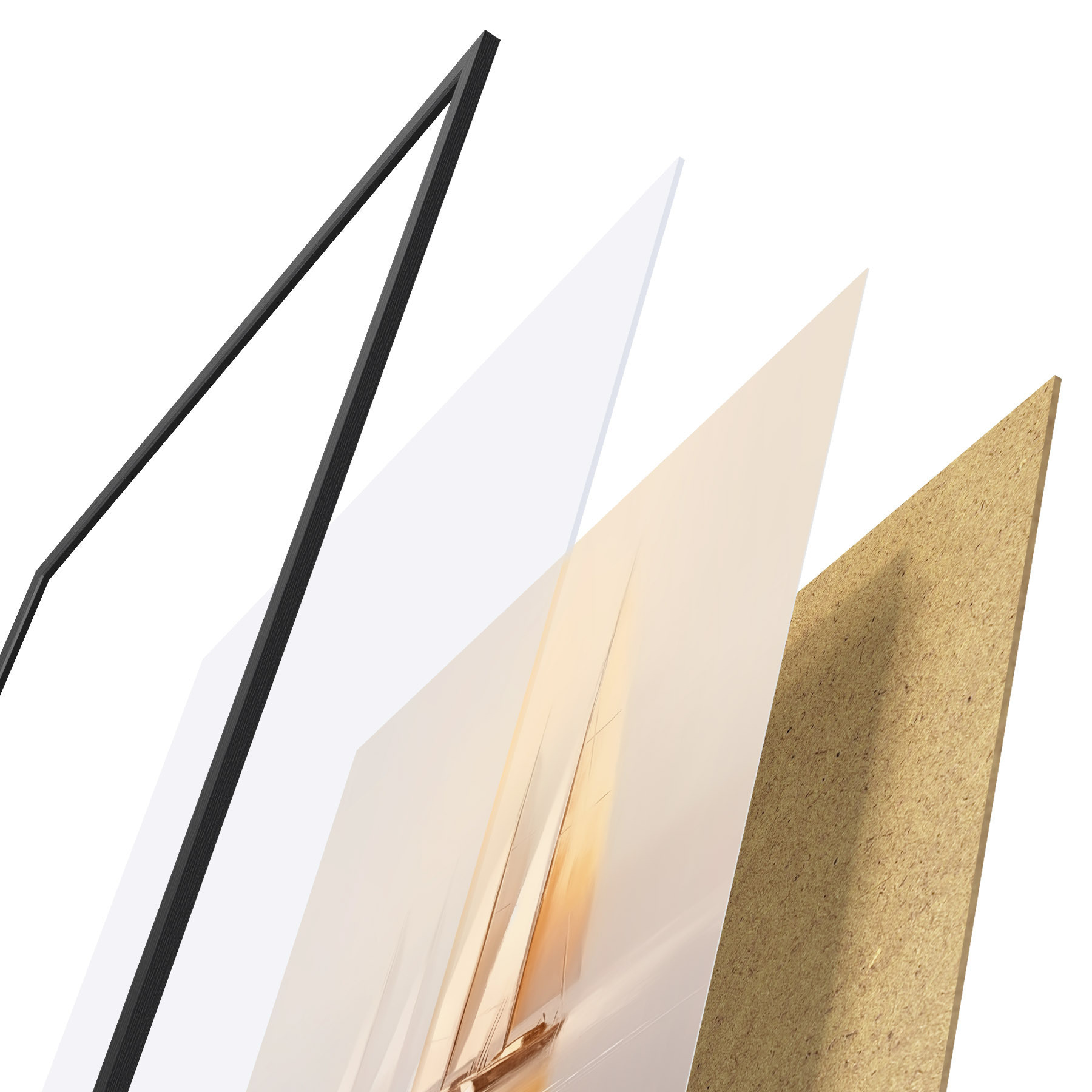 De poster bestaat uit een frame, plexiglas, geprinte afbeelding en spaanplaat achterkant. De poster kan meteen aan de muur worden gehangen dankzij de bevestigingen op de achterkant.