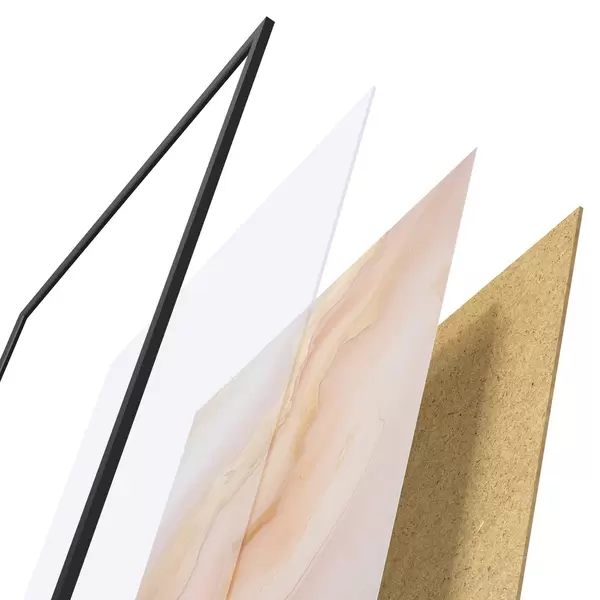 De poster bestaat uit een frame, plexiglas, geprinte afbeelding en spaanplaat achterkant. De poster kan meteen aan de muur worden gehangen dankzij de bevestigingen op de achterkant.