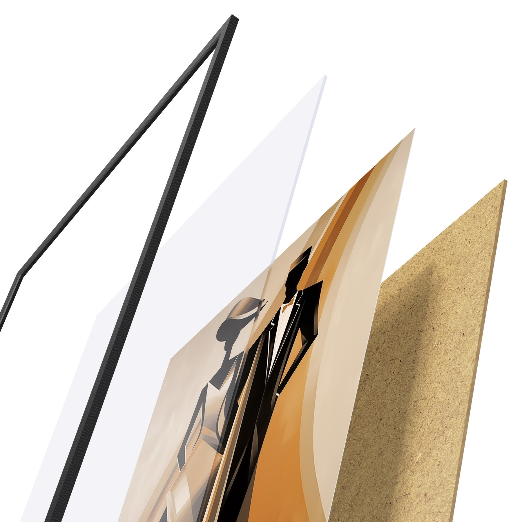 De poster bestaat uit een frame, plexiglas, geprinte afbeelding en spaanplaat achterkant. De poster kan meteen aan de muur worden gehangen dankzij de bevestigingen op de achterkant.
