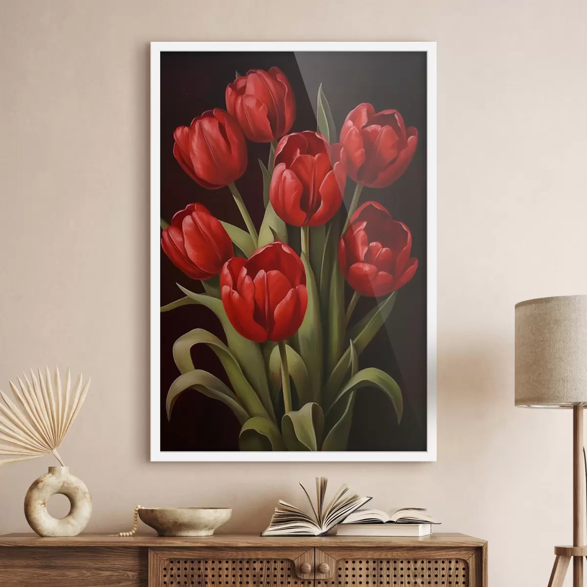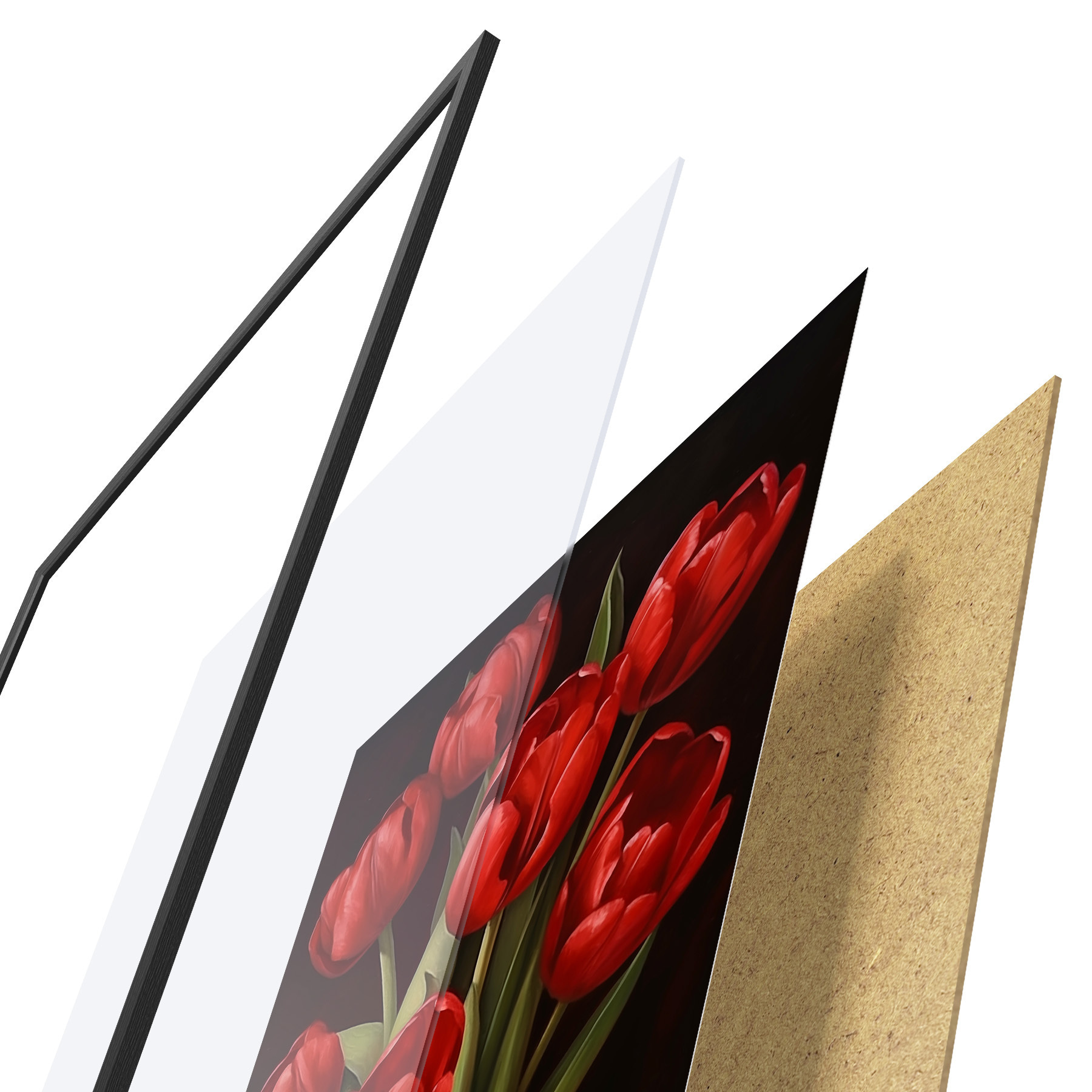 De poster bestaat uit een frame, plexiglas, geprinte afbeelding en spaanplaat achterkant. De poster kan meteen aan de muur worden gehangen dankzij de bevestigingen op de achterkant.