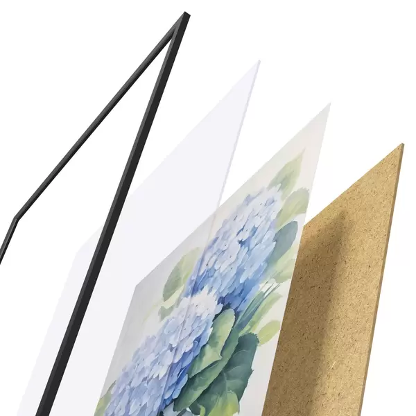 De poster bestaat uit een frame, plexiglas, geprinte afbeelding en spaanplaat achterkant. De poster kan meteen aan de muur worden gehangen dankzij de bevestigingen op de achterkant.