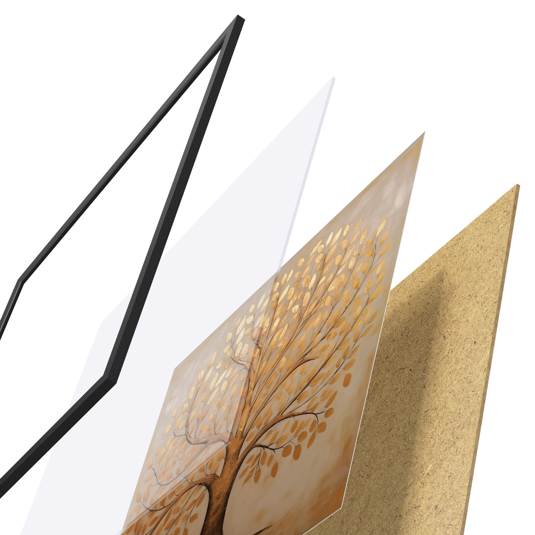 De poster bestaat uit een frame, plexiglas, geprinte afbeelding en spaanplaat achterkant. De poster kan meteen aan de muur worden gehangen dankzij de bevestigingen op de achterkant.