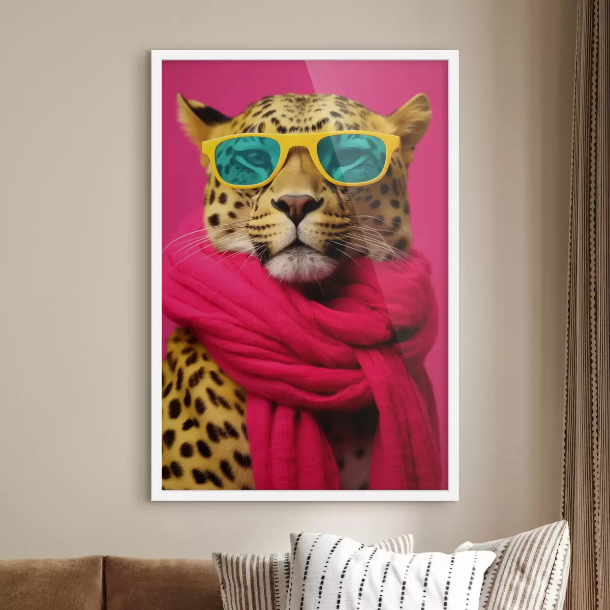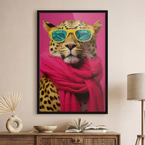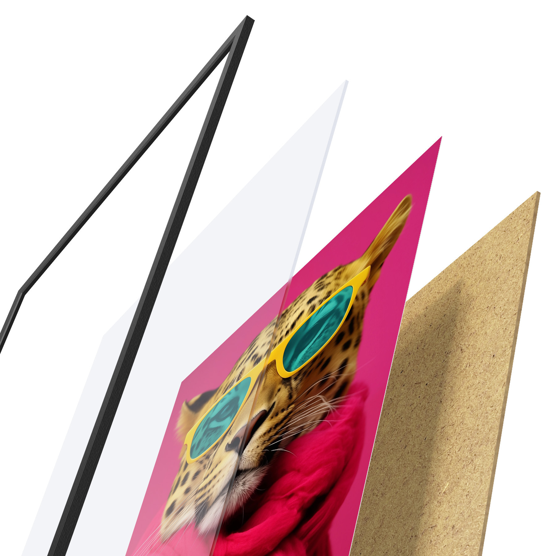 De poster bestaat uit een frame, plexiglas, geprinte afbeelding en spaanplaat achterkant. De poster kan meteen aan de muur worden gehangen dankzij de bevestigingen op de achterkant.