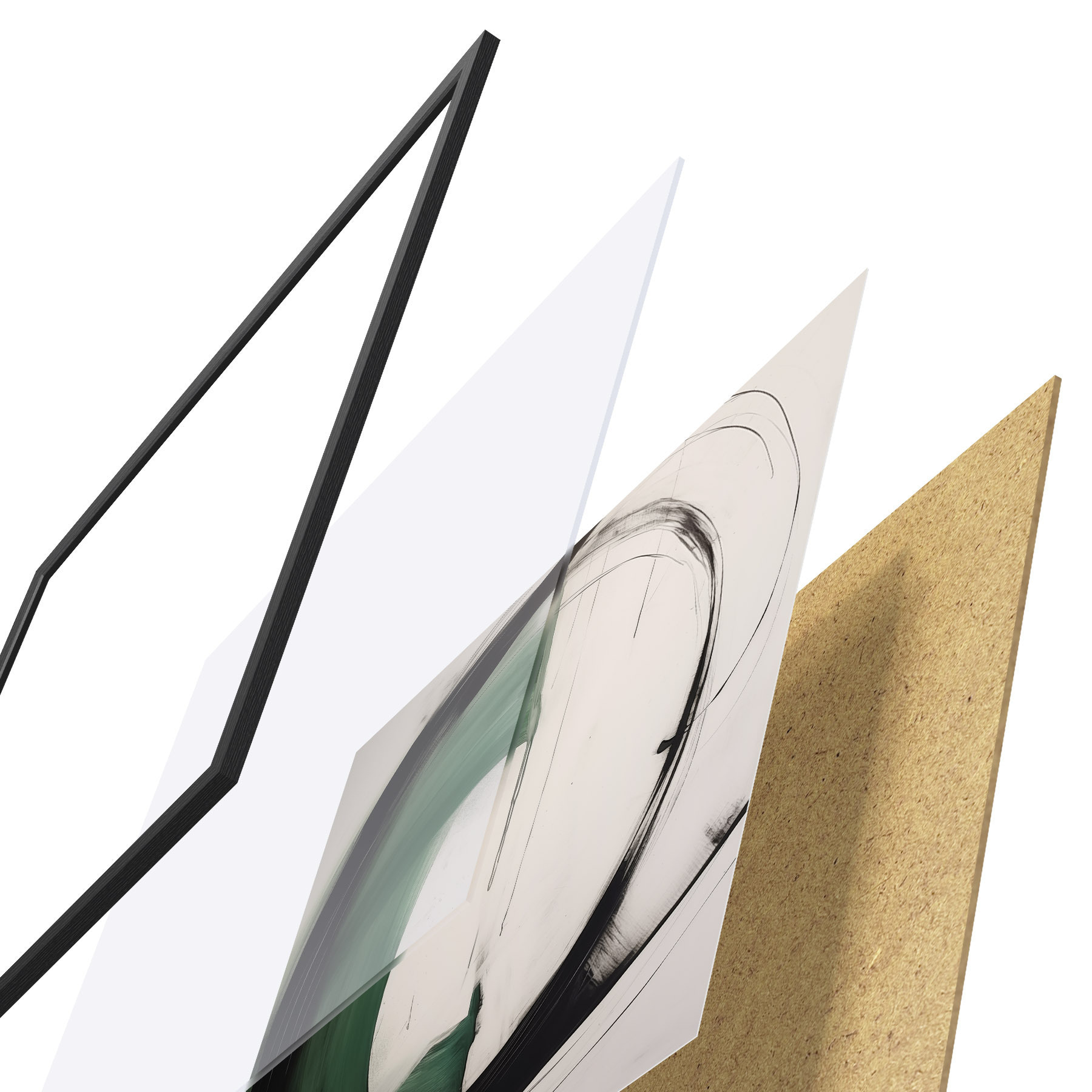 De poster bestaat uit een frame, plexiglas, geprinte afbeelding en spaanplaat achterkant. De poster kan meteen aan de muur worden gehangen dankzij de bevestigingen op de achterkant.