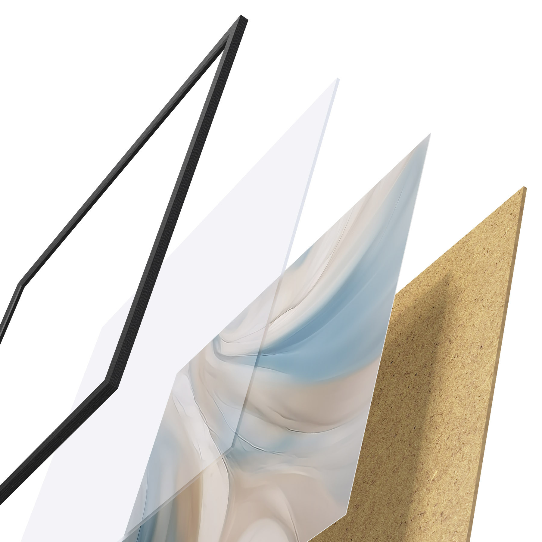 De poster bestaat uit een frame, plexiglas, geprinte afbeelding en spaanplaat achterkant. De poster kan meteen aan de muur worden gehangen dankzij de bevestigingen op de achterkant.
