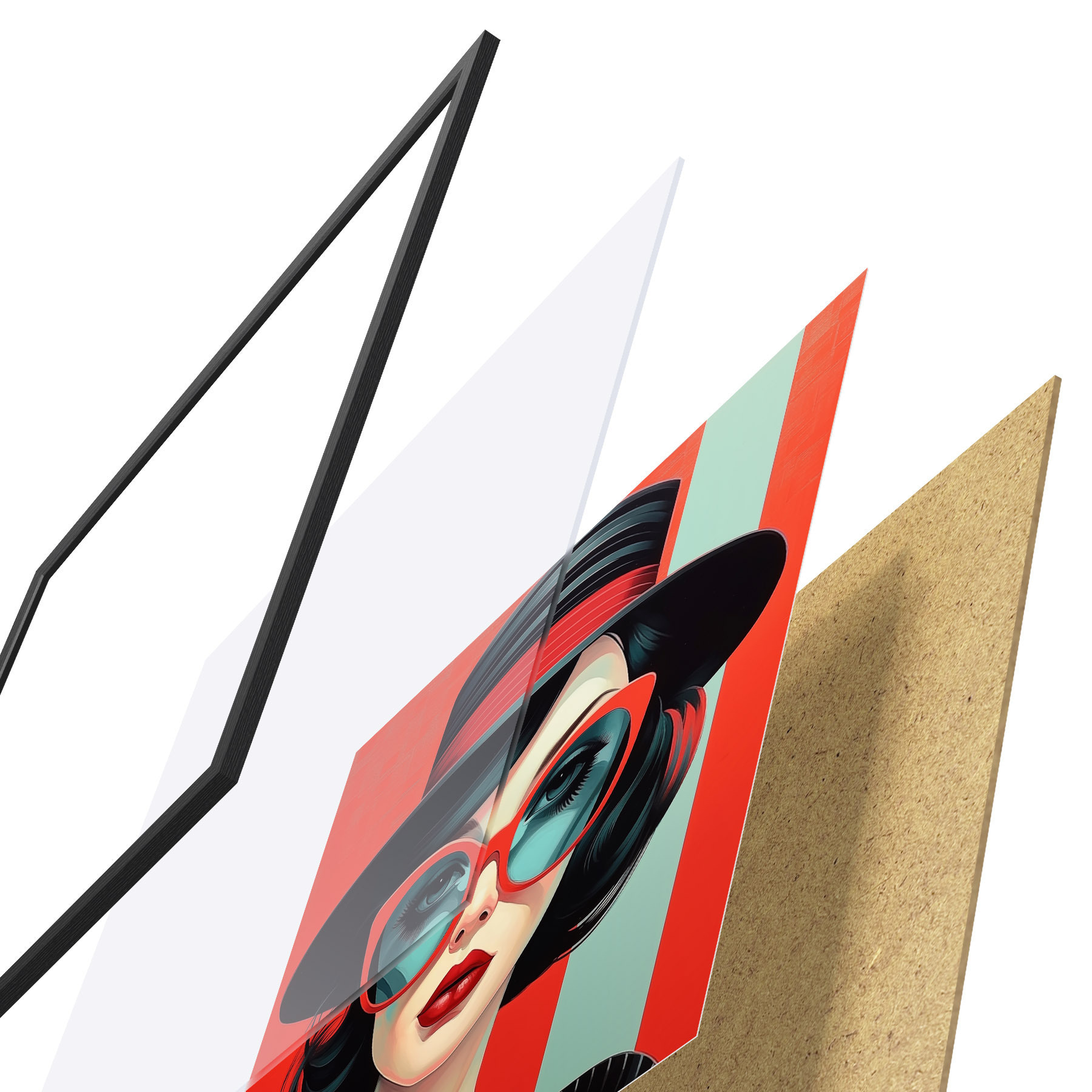 De poster bestaat uit een frame, plexiglas, geprinte afbeelding en spaanplaat achterkant. De poster kan meteen aan de muur worden gehangen dankzij de bevestigingen op de achterkant.