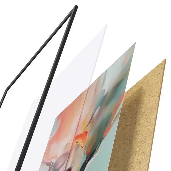 De poster bestaat uit een frame, plexiglas, geprinte afbeelding en spaanplaat achterkant. De poster kan meteen aan de muur worden gehangen dankzij de bevestigingen op de achterkant.