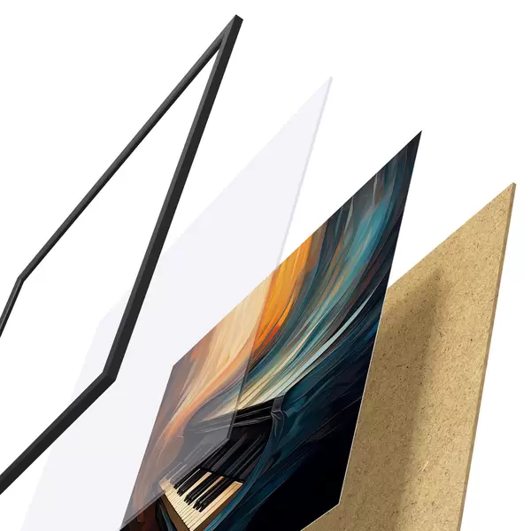 De poster bestaat uit een frame, plexiglas, geprinte afbeelding en spaanplaat achterkant. De poster kan meteen aan de muur worden gehangen dankzij de bevestigingen op de achterkant.