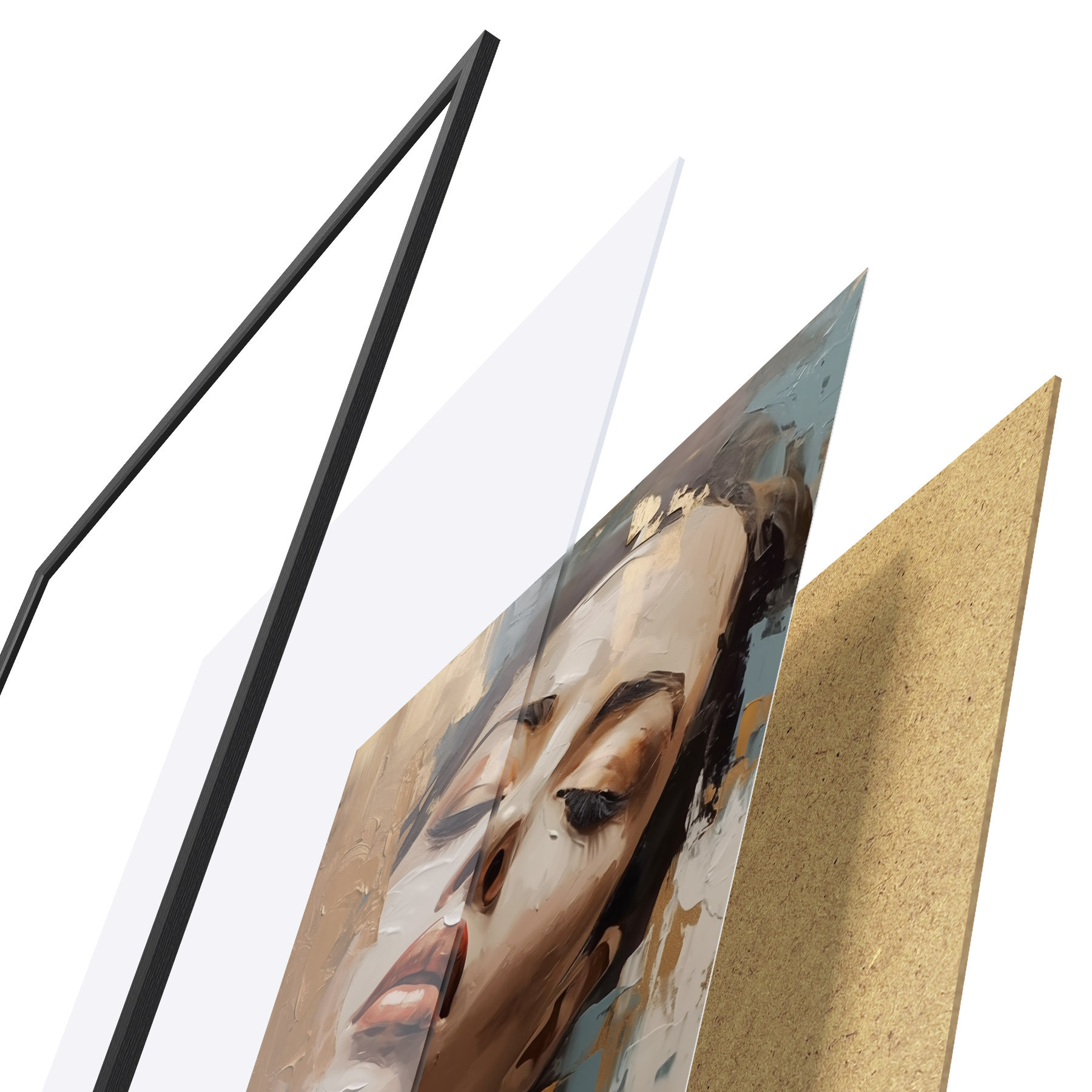 De poster bestaat uit een frame, plexiglas, geprinte afbeelding en spaanplaat achterkant. De poster kan meteen aan de muur worden gehangen dankzij de bevestigingen op de achterkant.
