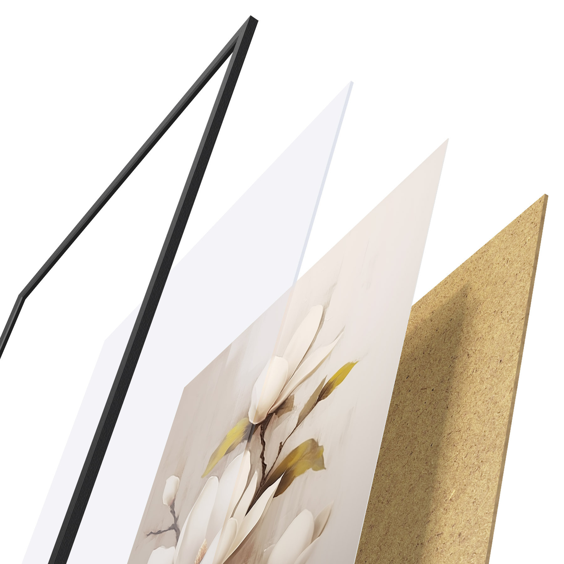 De poster bestaat uit een frame, plexiglas, geprinte afbeelding en spaanplaat achterkant. De poster kan meteen aan de muur worden gehangen dankzij de bevestigingen op de achterkant.