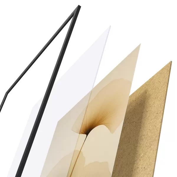 De poster bestaat uit een frame, plexiglas, geprinte afbeelding en spaanplaat achterkant. De poster kan meteen aan de muur worden gehangen dankzij de bevestigingen op de achterkant.