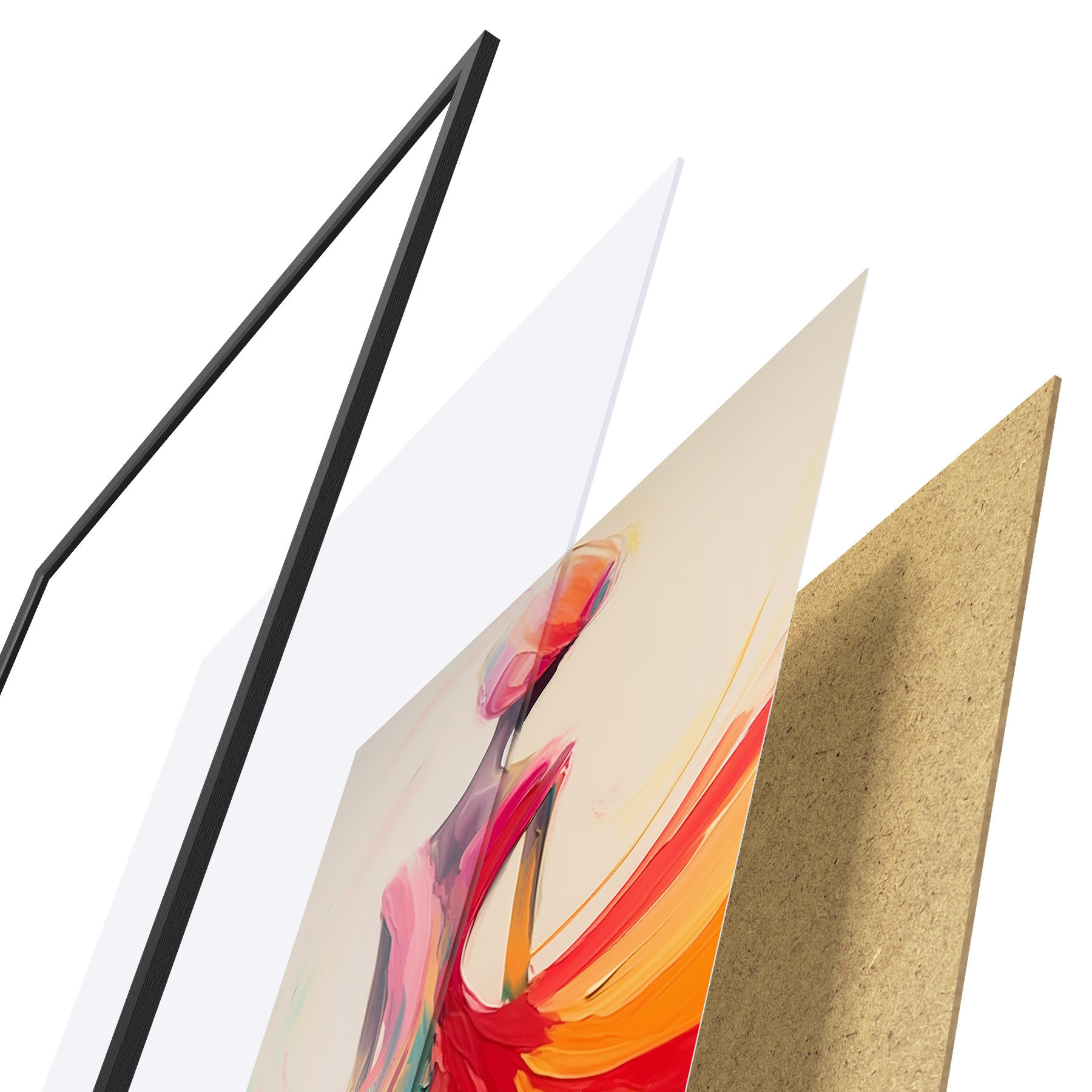 De poster bestaat uit een frame, plexiglas, geprinte afbeelding en spaanplaat achterkant. De poster kan meteen aan de muur worden gehangen dankzij de bevestigingen op de achterkant.