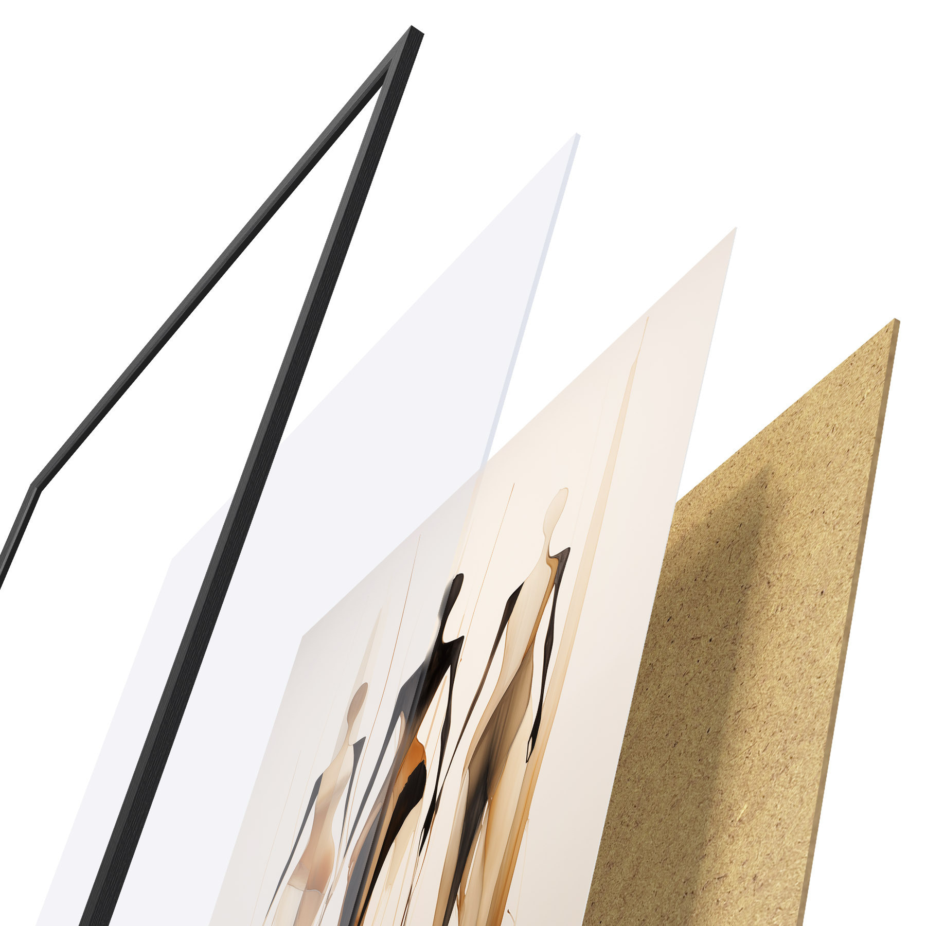 De poster bestaat uit een frame, plexiglas, geprinte afbeelding en spaanplaat achterkant. De poster kan meteen aan de muur worden gehangen dankzij de bevestigingen op de achterkant.