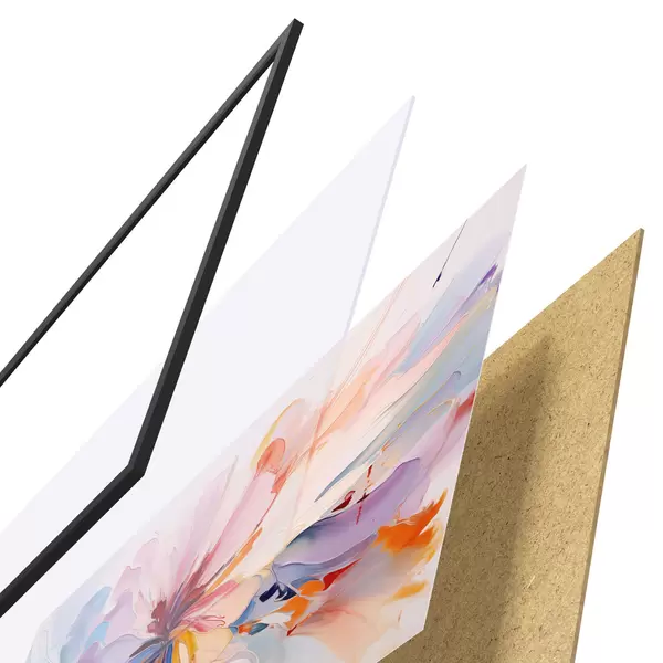 De poster bestaat uit een frame, plexiglas, geprinte afbeelding en spaanplaat achterkant. De poster kan meteen aan de muur worden gehangen dankzij de bevestigingen op de achterkant.