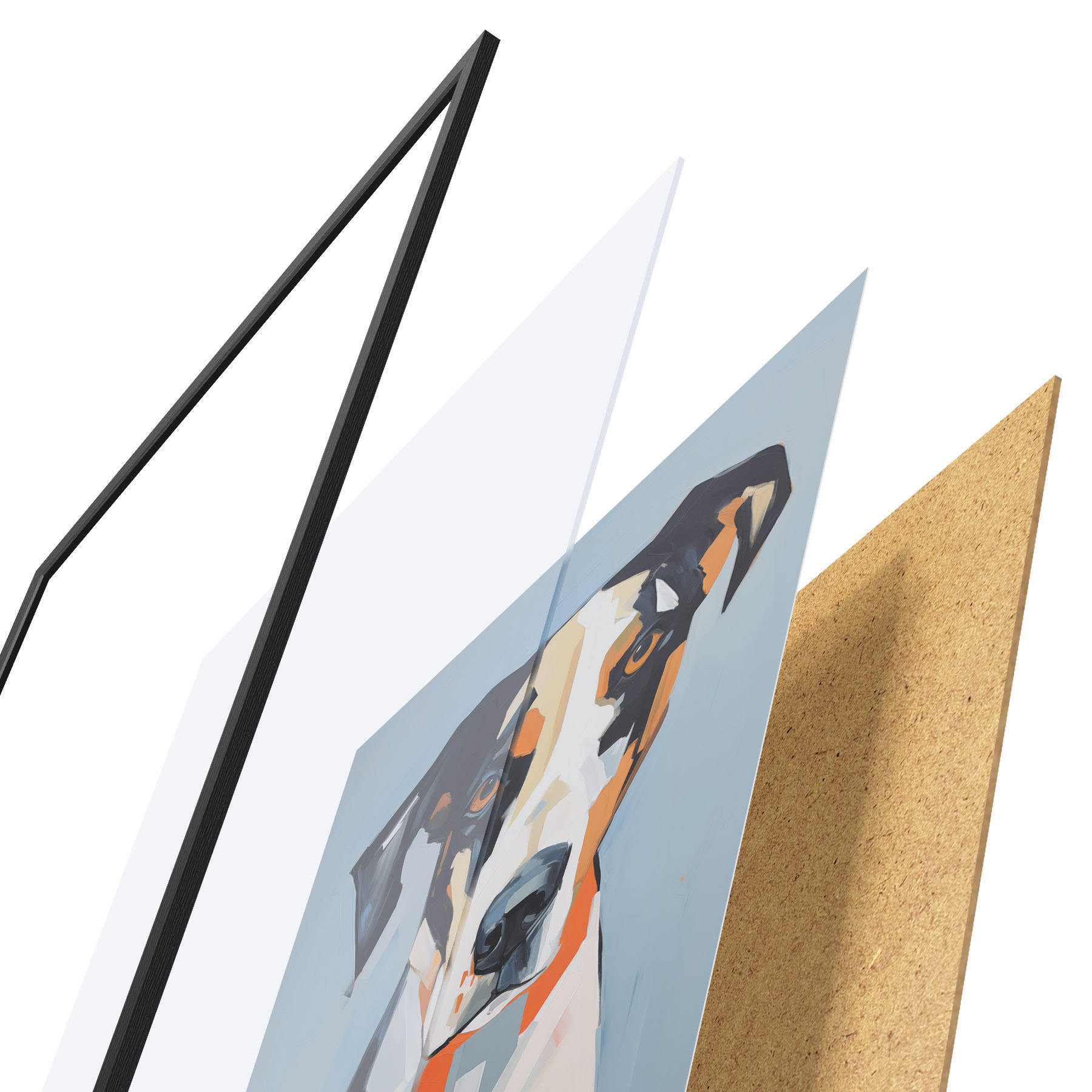 De poster bestaat uit een frame, plexiglas, geprinte afbeelding en spaanplaat achterkant. De poster kan meteen aan de muur worden gehangen dankzij de bevestigingen op de achterkant.