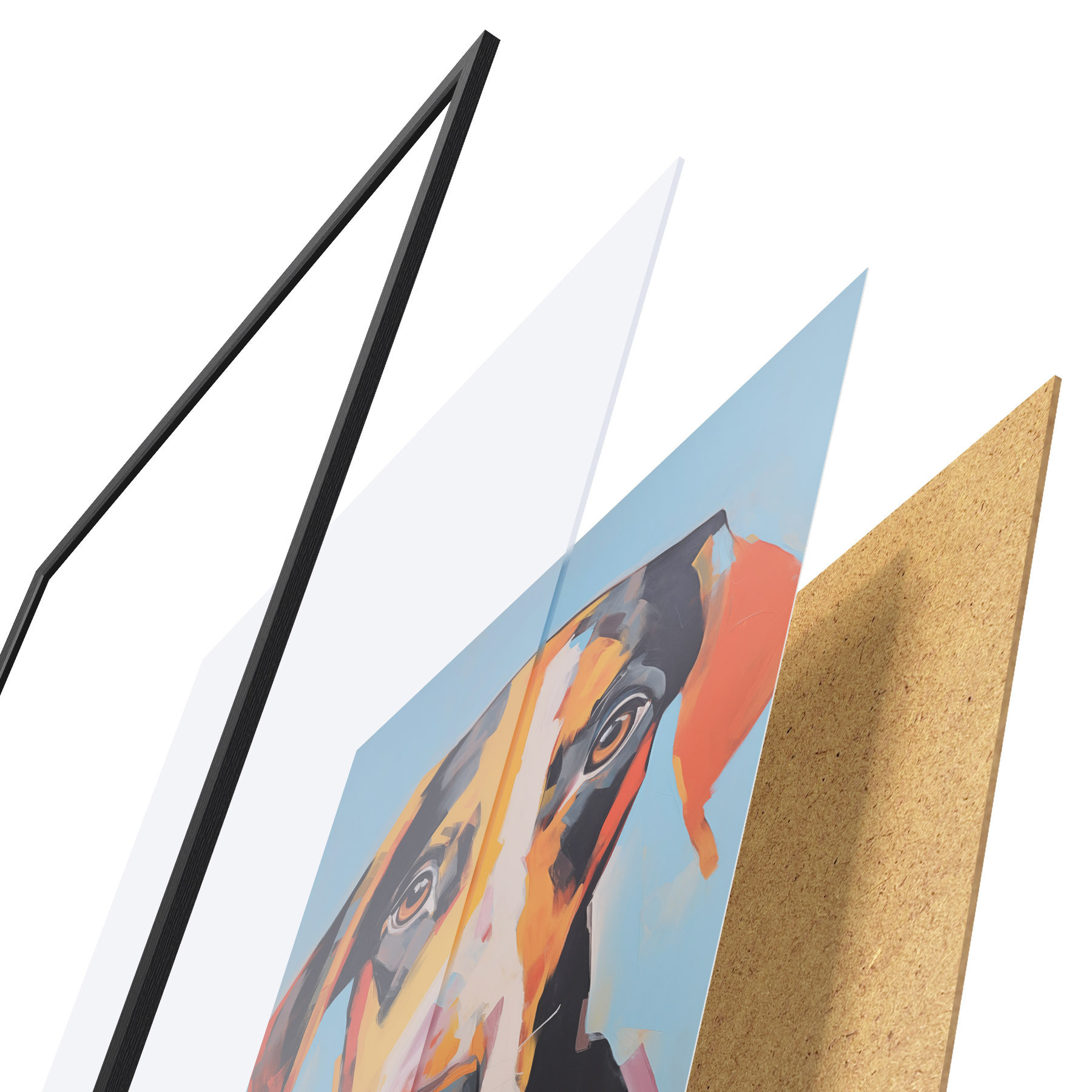 De poster bestaat uit een frame, plexiglas, geprinte afbeelding en spaanplaat achterkant. De poster kan meteen aan de muur worden gehangen dankzij de bevestigingen op de achterkant.