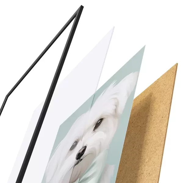 De poster bestaat uit een frame, plexiglas, geprinte afbeelding en spaanplaat achterkant. De poster kan meteen aan de muur worden gehangen dankzij de bevestigingen op de achterkant.