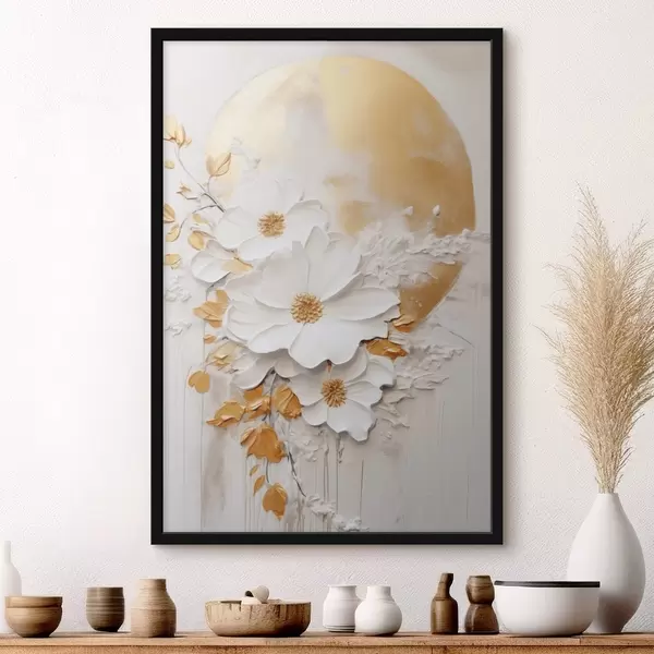 Poster Witte bloemen met gele accenten en delicate bladeren tegen een gestructureerde achtergrond, moderne kunst N° f47414