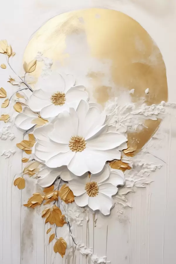 Poster Witte bloemen met gele accenten en delicate bladeren tegen een gestructureerde achtergrond, moderne kunst N° f47414