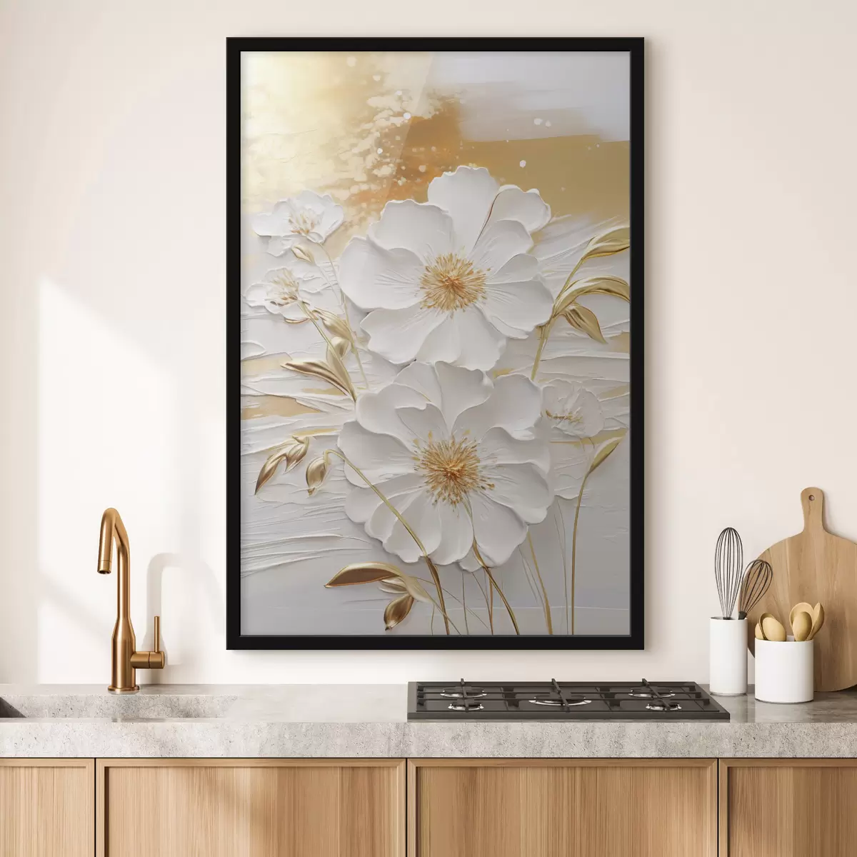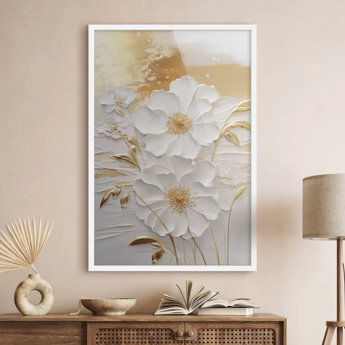 Poster Witte bloemen met gele accenten en delicate bladeren tegen een gestructureerde achtergrond, moderne kunst N° f47415