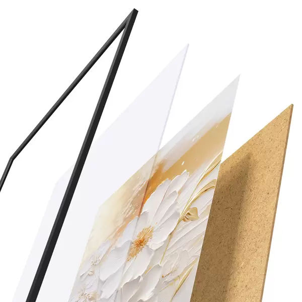De poster bestaat uit een frame, plexiglas, geprinte afbeelding en spaanplaat achterkant. De poster kan meteen aan de muur worden gehangen dankzij de bevestigingen op de achterkant.