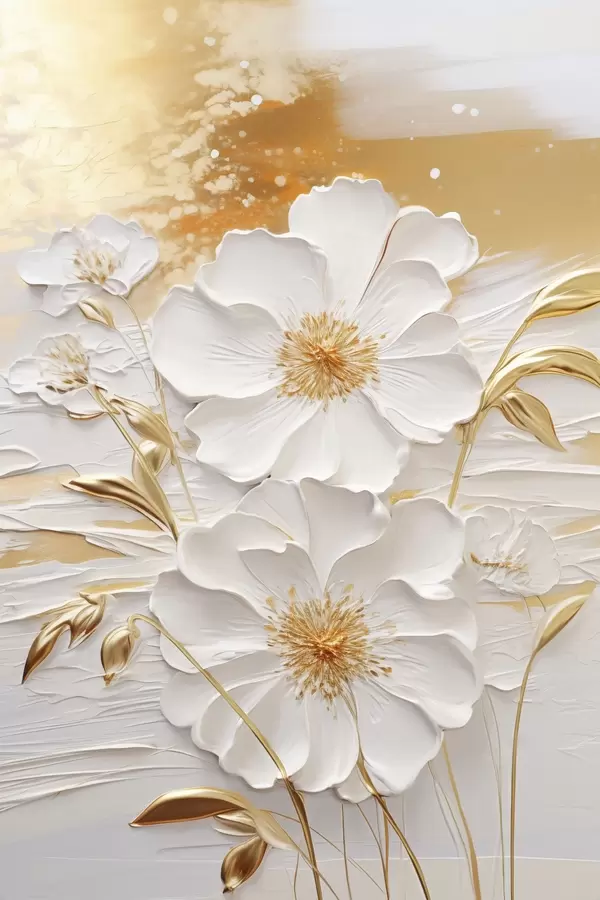 Poster Witte bloemen met gele accenten en delicate bladeren tegen een gestructureerde achtergrond, moderne kunst N° f47415
