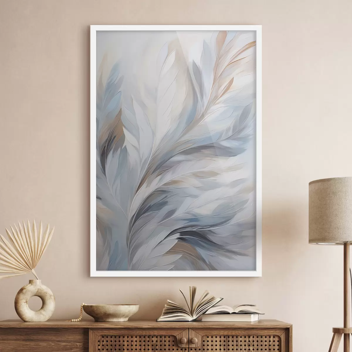 Poster Delicate lichtblauwe en bruine veren met een zachte, etherische textuur, tegen een witte achtergrond f47416