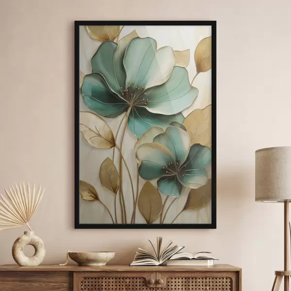 Poster Grote blauwgroene en gele bloemen met contouren, omgeven door gele bladeren tegen een abstracte achtergrond N° f47418