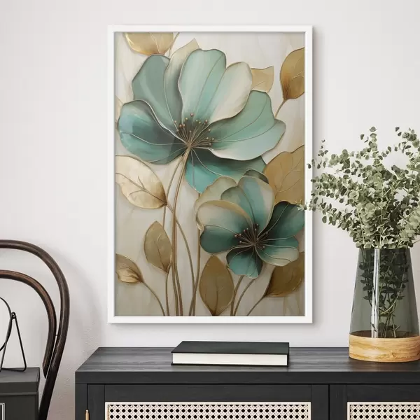 Poster Grote blauwgroene en gele bloemen met contouren, omgeven door gele bladeren tegen een abstracte achtergrond f47418