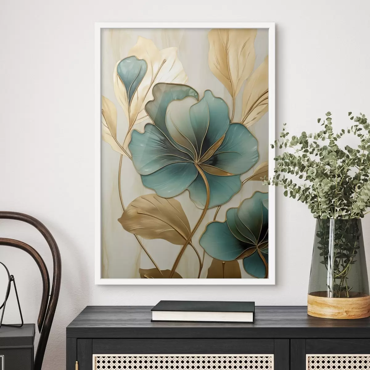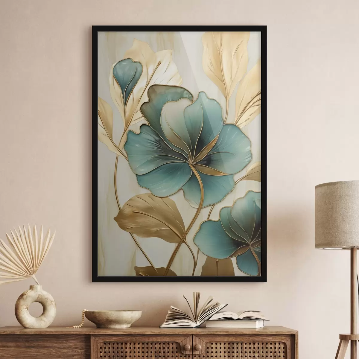 Poster Grote blauwgroene en gele bloemen met contouren, omgeven door gele bladeren tegen een abstracte achtergrond N° f47419