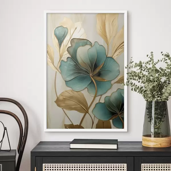 Poster Grote blauwgroene en gele bloemen met contouren, omgeven door gele bladeren tegen een abstracte achtergrond f47419