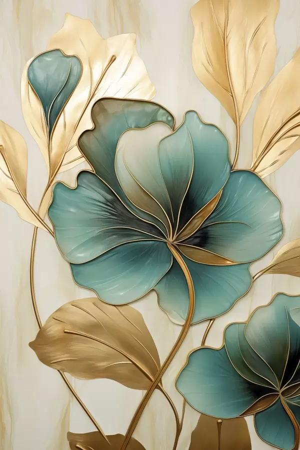 Poster Grote blauwgroene en gele bloemen met contouren, omgeven door gele bladeren tegen een abstracte achtergrond N° f47419