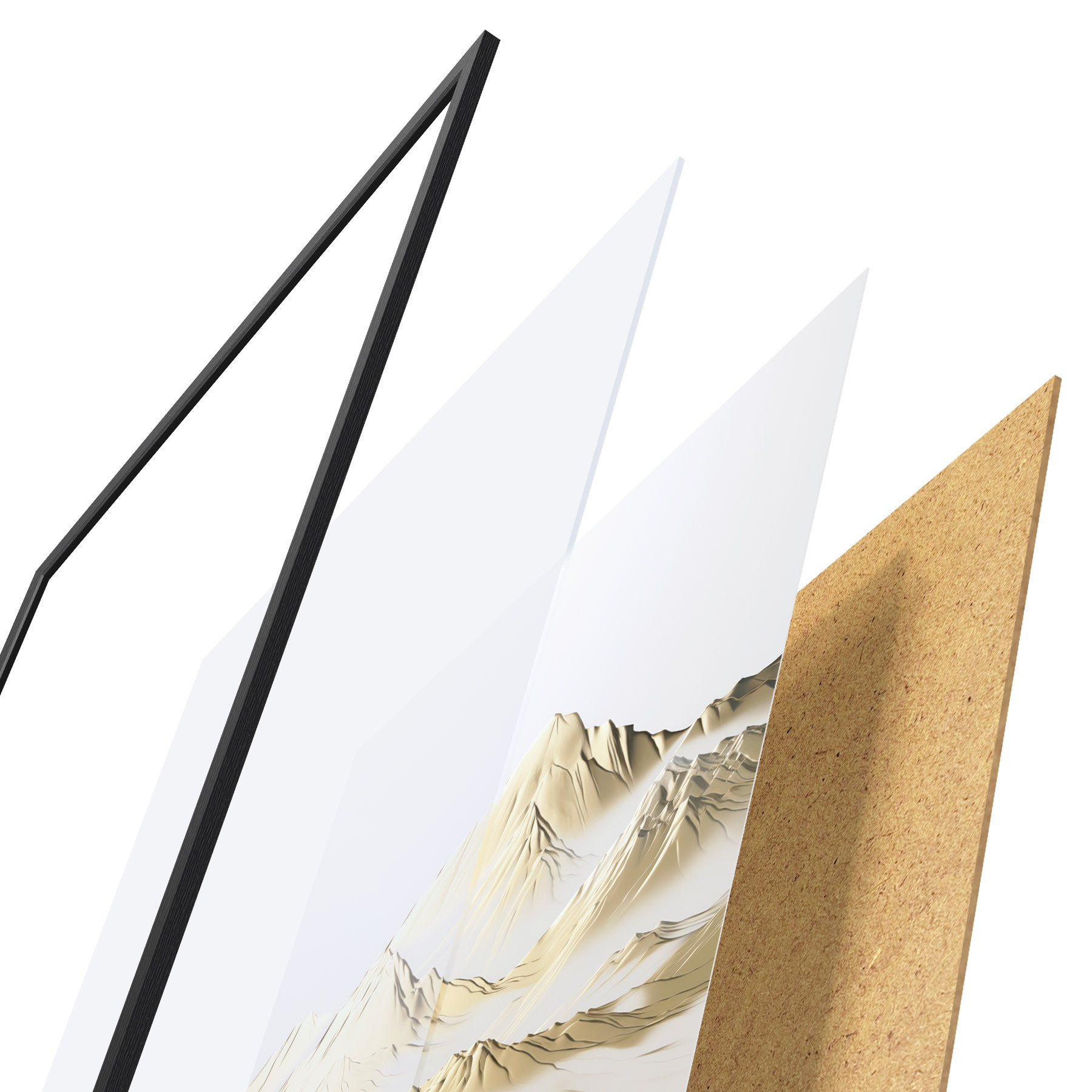 De poster bestaat uit een frame, plexiglas, geprinte afbeelding en spaanplaat achterkant. De poster kan meteen aan de muur worden gehangen dankzij de bevestigingen op de achterkant.