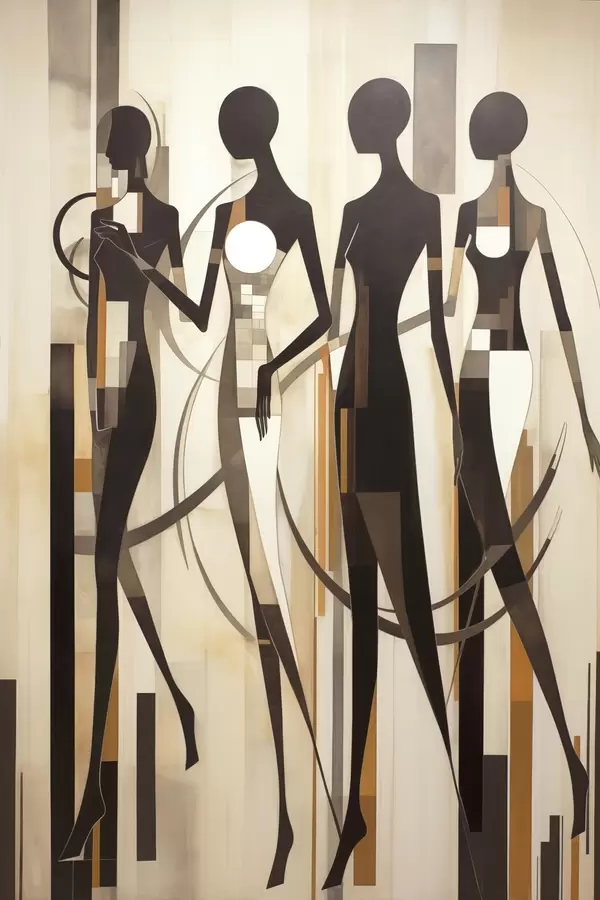 Poster Gestileerde vrouwelijke figuren met geometrische elementen tegen een abstracte achtergrond van verticale lijnen N° f47423