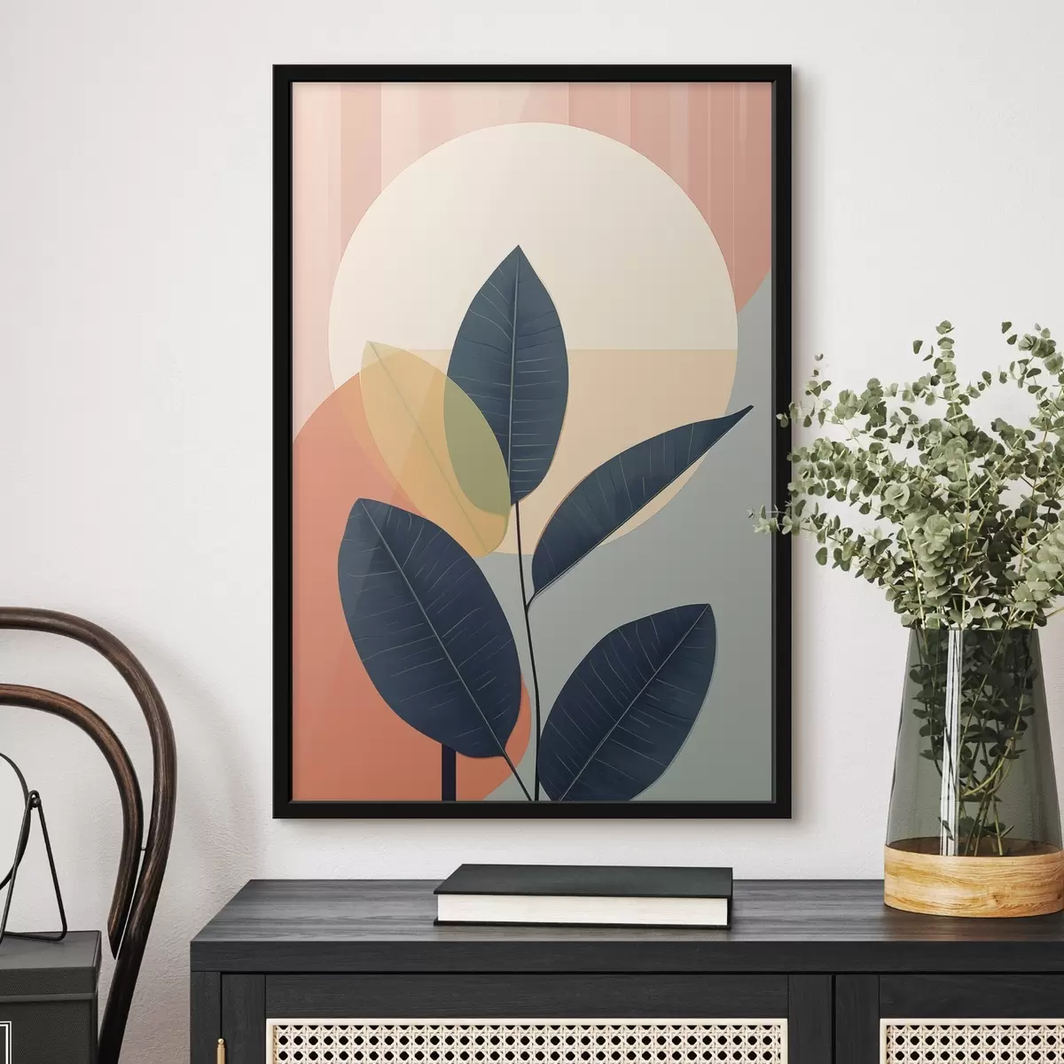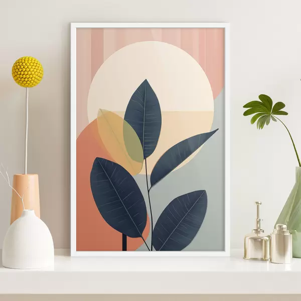 Poster Donkere bladeren tegen een achtergrond van abstracte vormen in perzik en grijs met een grote, lichtgele cirkel N° f47424