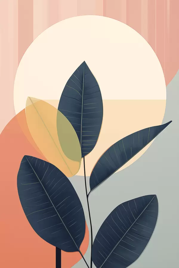 Poster Donkere bladeren tegen een achtergrond van abstracte vormen in perzik en grijs met een grote, lichtgele cirkel N° f47424