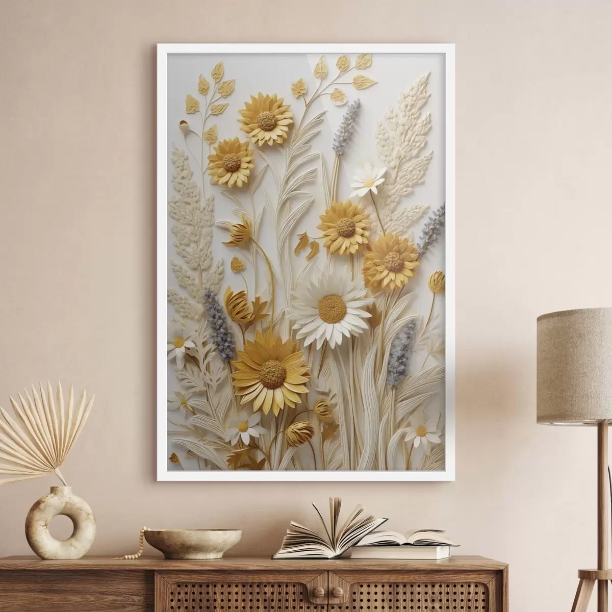 Poster Een collectie met textuur van gele en witte madeliefjes met gedroogde grassen en lavendeltakjes op een witte achtergrond N° f47430