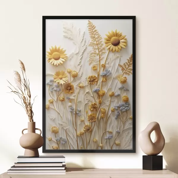 Poster Een collectie met textuur van gele en witte madeliefjes met gedroogde grassen en lavendeltakjes op een witte achtergrond N° f47431