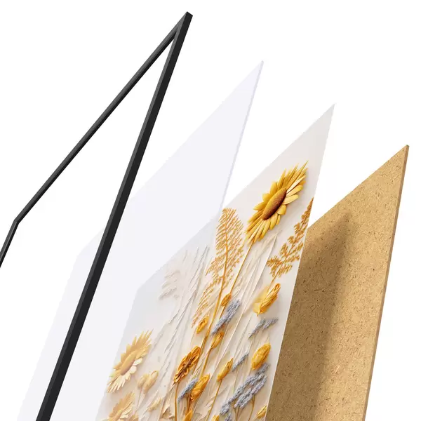 De poster bestaat uit een frame, plexiglas, geprinte afbeelding en spaanplaat achterkant. De poster kan meteen aan de muur worden gehangen dankzij de bevestigingen op de achterkant.