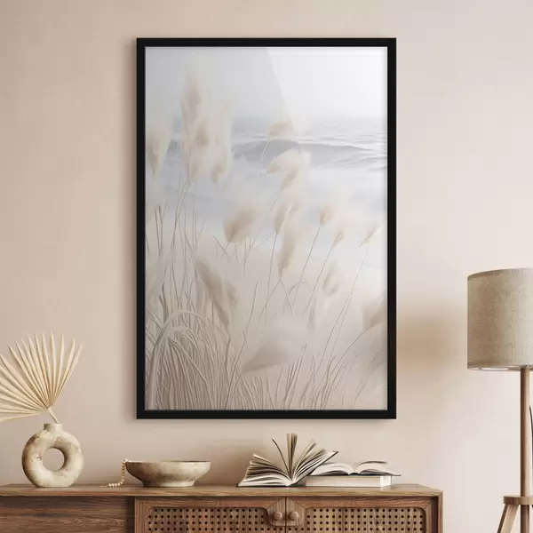 Poster Hoog, vederachtig pampagras in zachte beige tinten op de voorgrond, met een zandstrand op de achtergrond f47432
