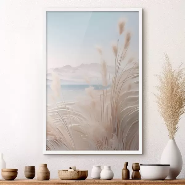 Poster Hoog, vederachtig pampagras in zachte beige tinten, met een zandstrand en bergen op de achtergrond N° f47433