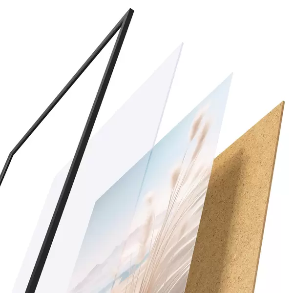 De poster bestaat uit een frame, plexiglas, geprinte afbeelding en spaanplaat achterkant. De poster kan meteen aan de muur worden gehangen dankzij de bevestigingen op de achterkant.