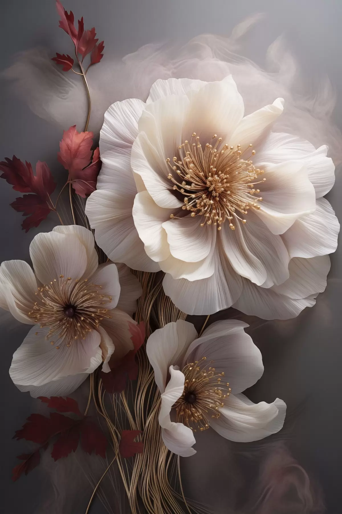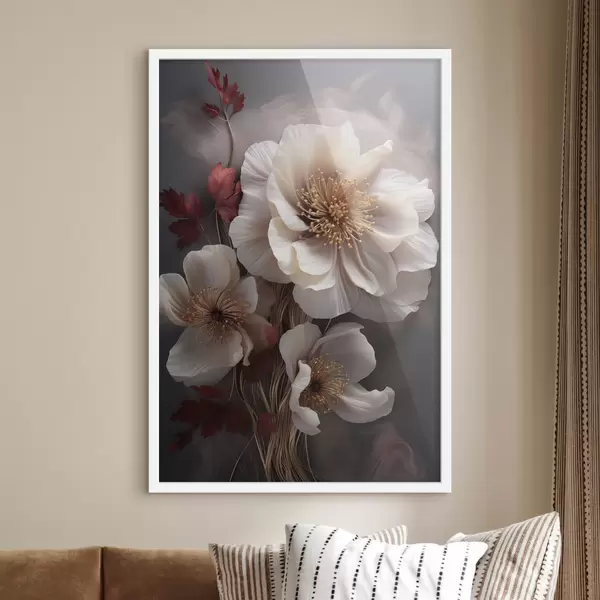 Poster Delicate pioenrozen met dunne, ijle bloemblaadjes, omgeven door donkerrode bladeren tegen een abstracte achtergrond N° f47434