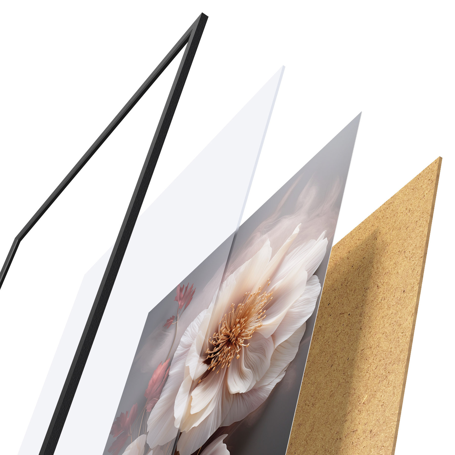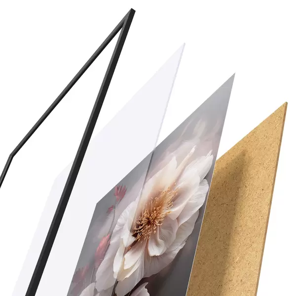 De poster bestaat uit een frame, plexiglas, geprinte afbeelding en spaanplaat achterkant. De poster kan meteen aan de muur worden gehangen dankzij de bevestigingen op de achterkant.