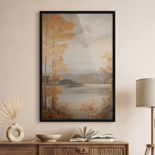 Poster Herfstbomen met oranje bladeren omlijsten een rustig meer met bergen in de verte onder een bewolkte hemel. N° f47441